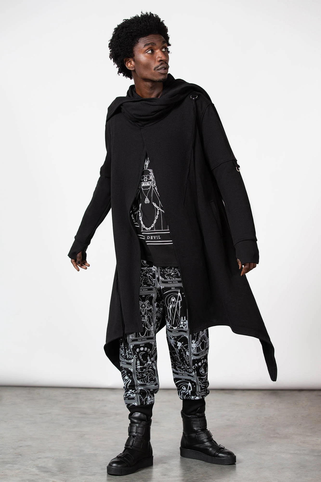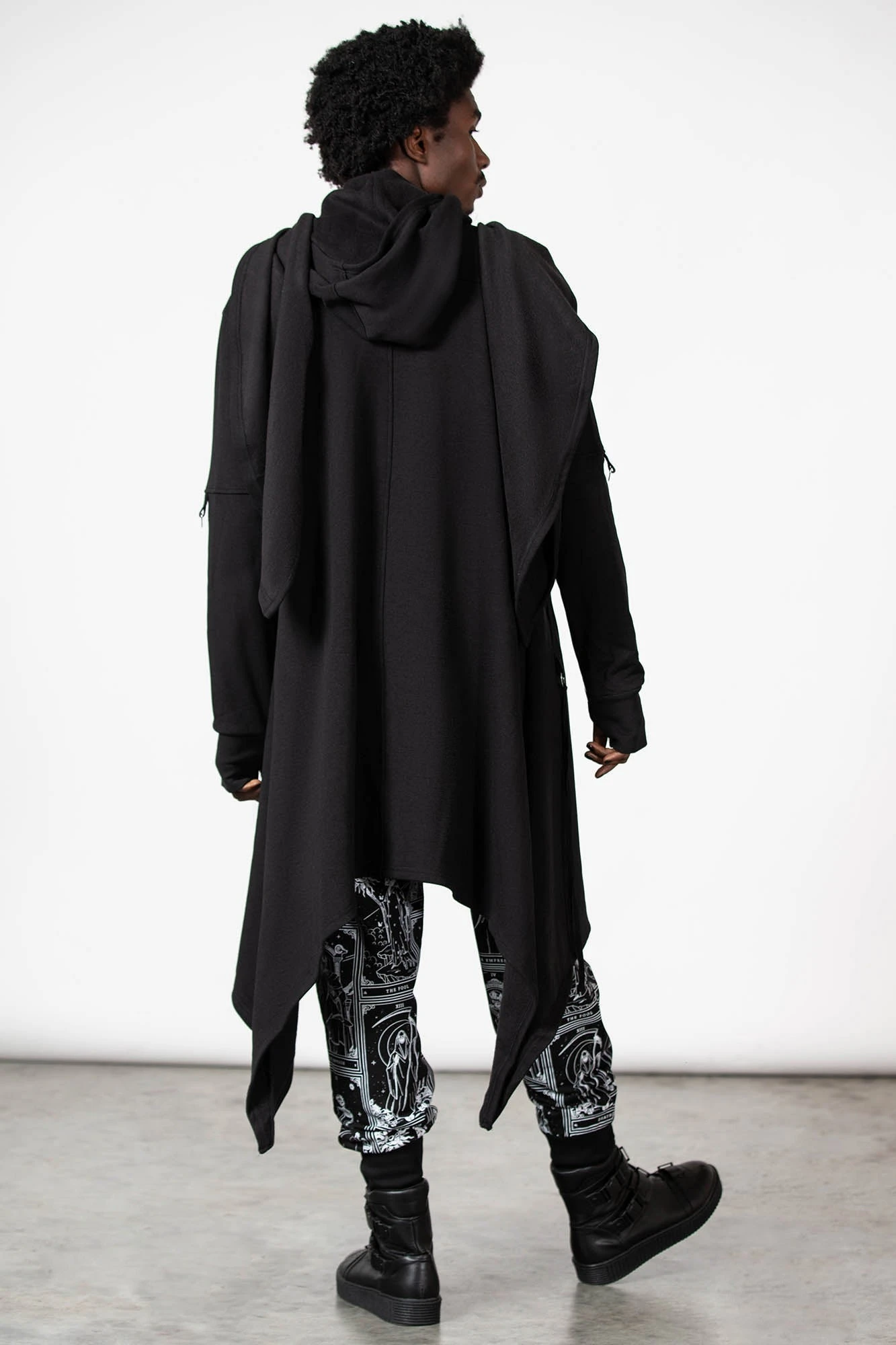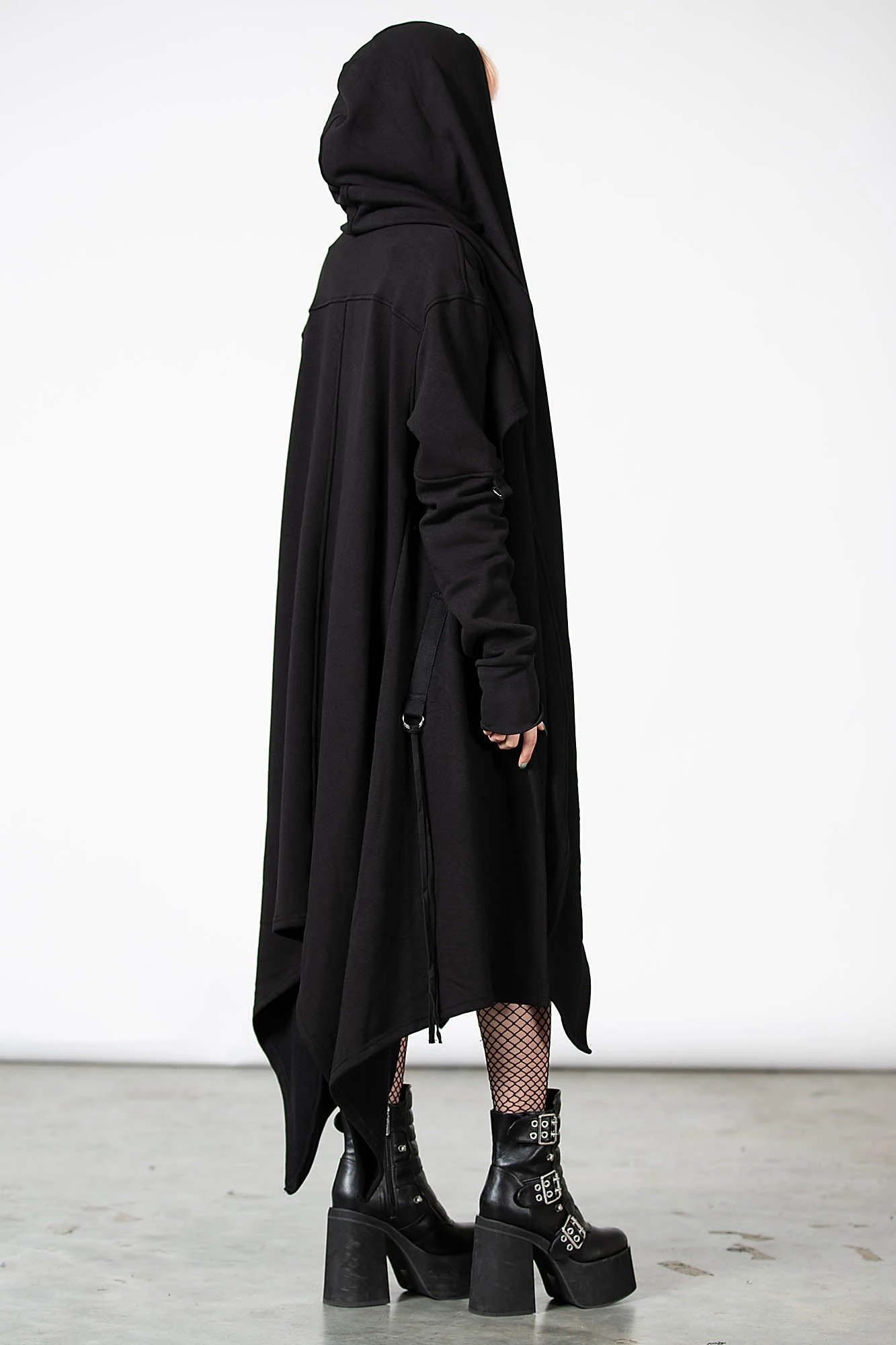 By the grace of the devil we give you this versatile and oh-so[ul]-lustful jersey cardigan; ‘Assassins’ is a dark layering piece with an oversized hood, draping + long length front, uneven hems and D-ring details to sleeves – complete with thumbholes. Yer ready for your midnight calls, dark baptisms or just plain old chill/thrill/kill – a guaranteed head-turner!