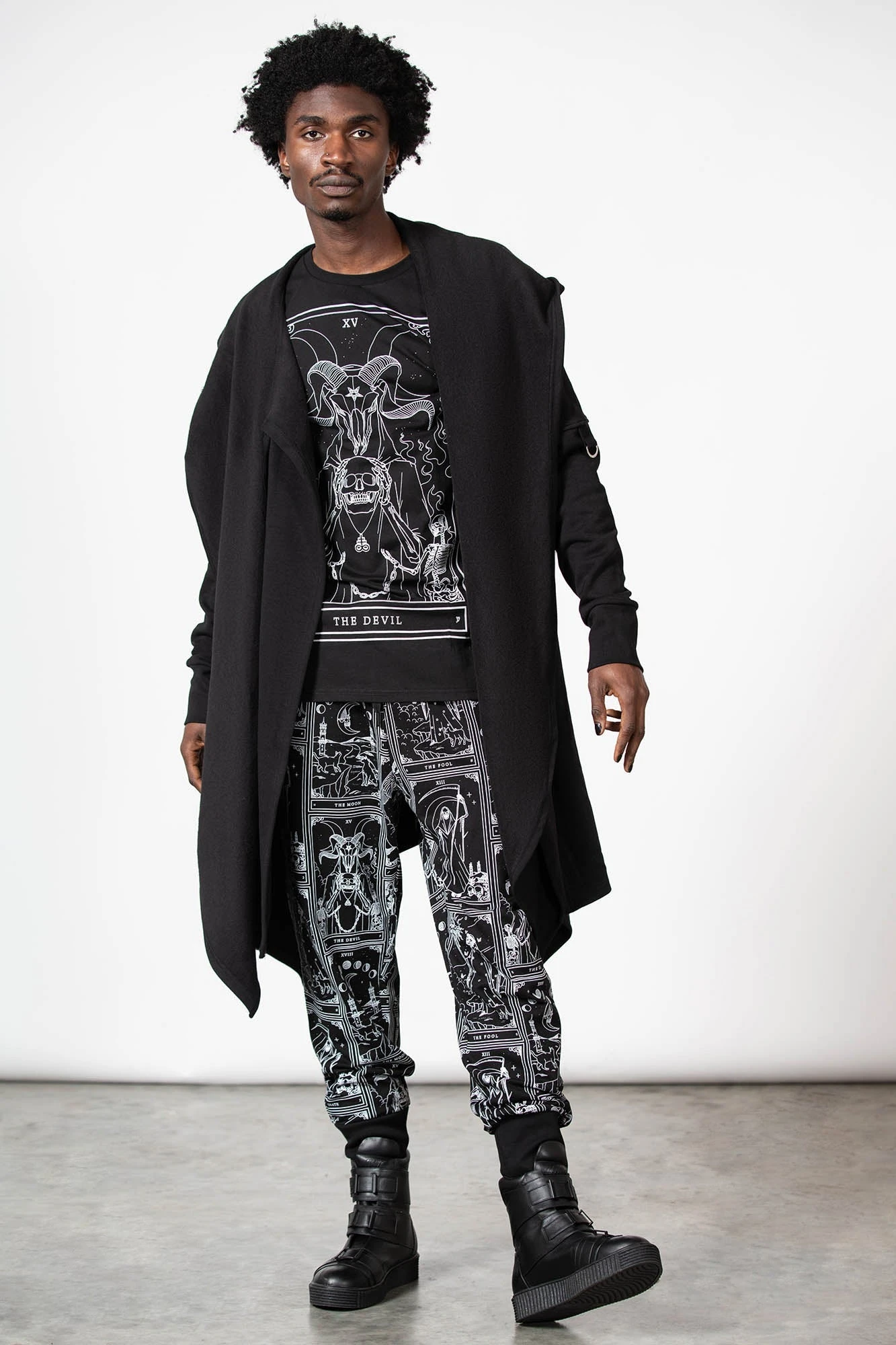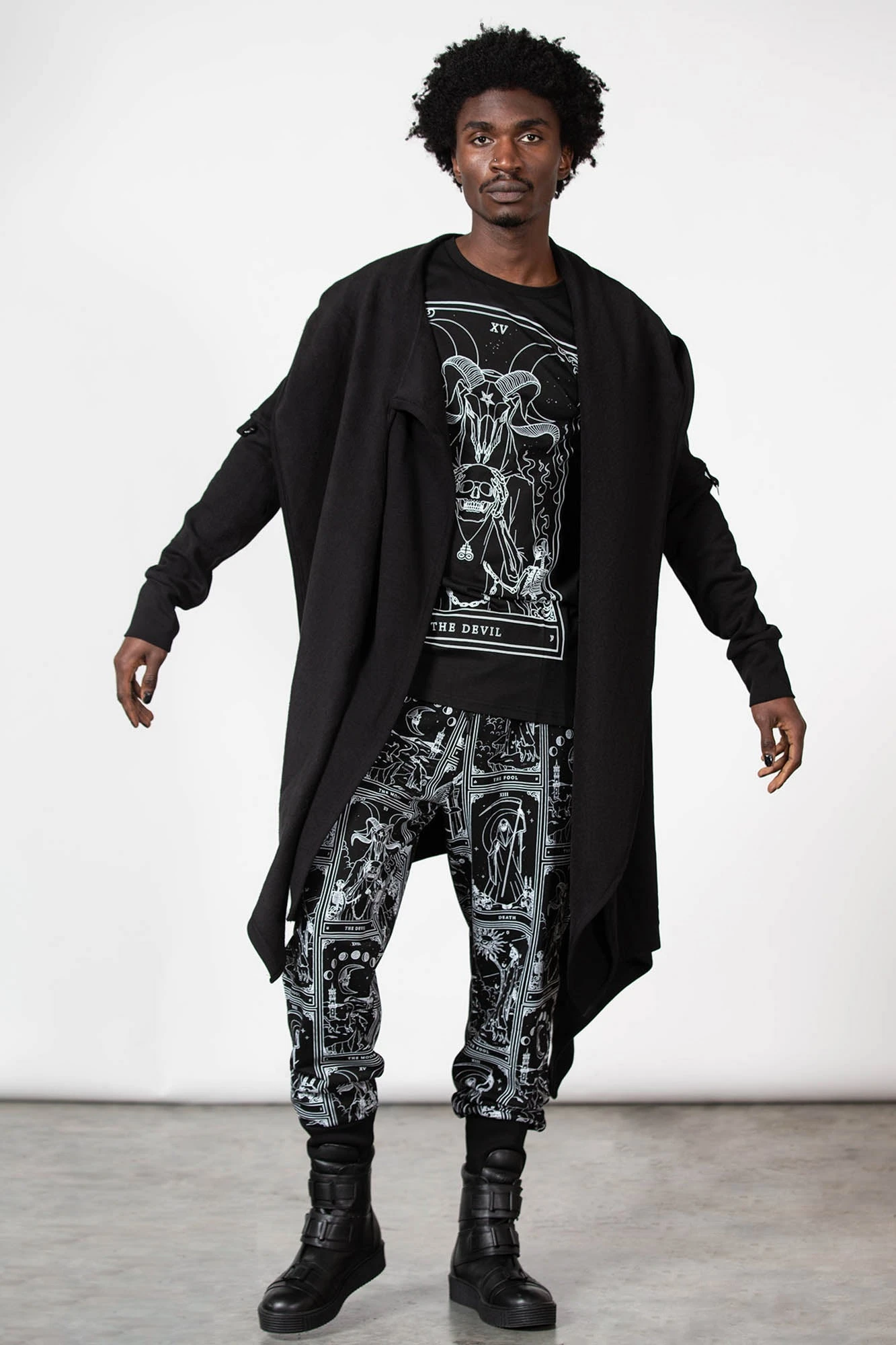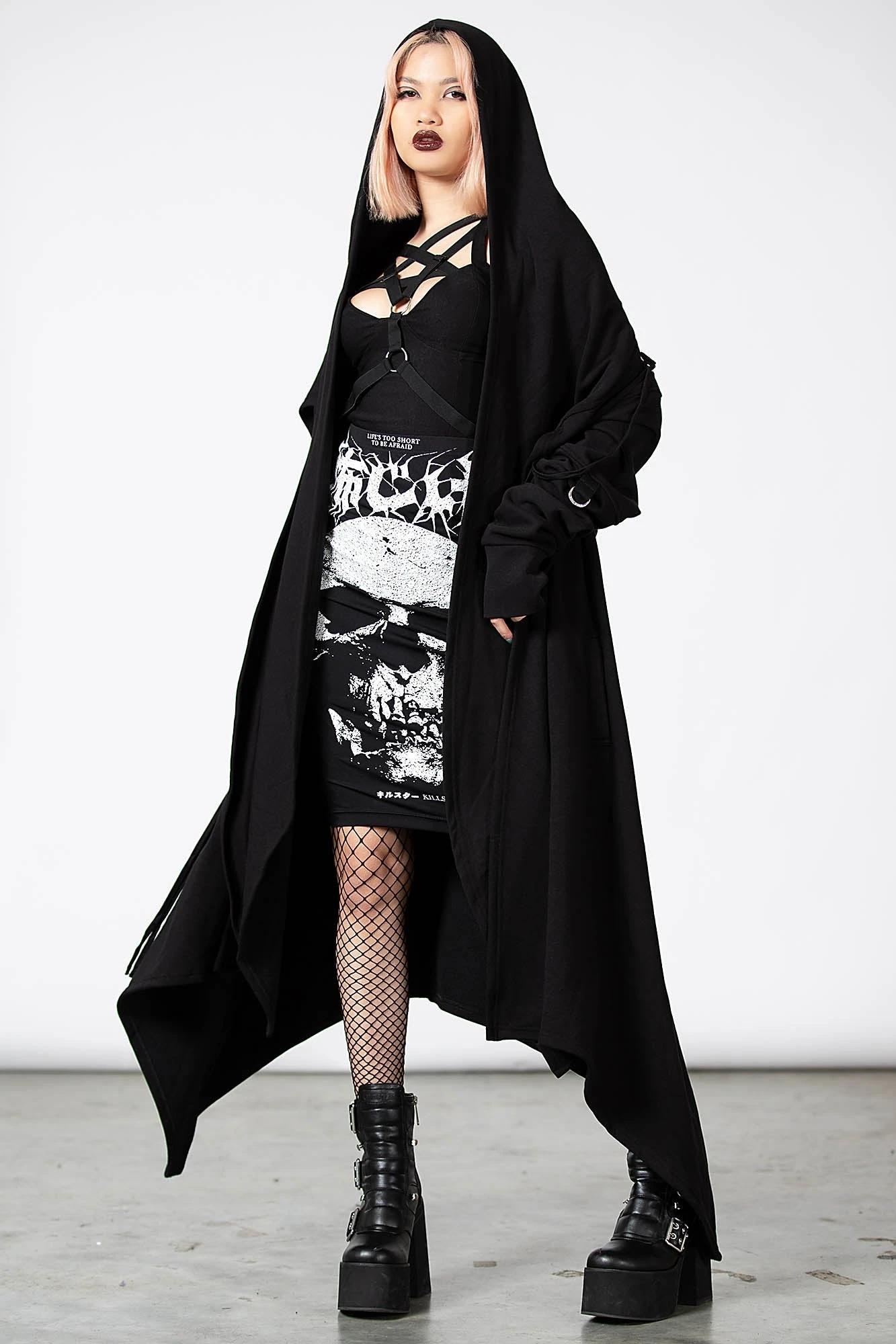 By the grace of the devil we give you this versatile and oh-so[ul]-lustful jersey cardigan; ‘Assassins’ is a dark layering piece with an oversized hood, draping + long length front, uneven hems and D-ring details to sleeves – complete with thumbholes. Yer ready for your midnight calls, dark baptisms or just plain old chill/thrill/kill – a guaranteed head-turner!
