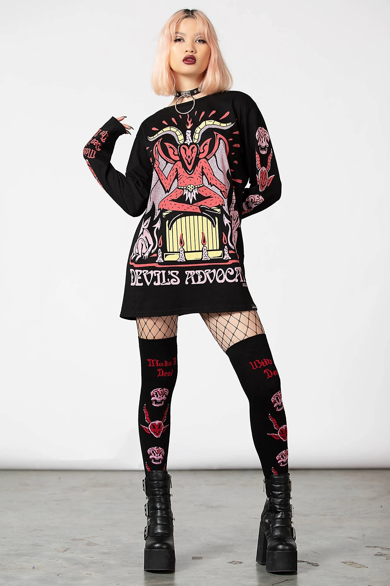 – Text reads “Make a deal with the devil” on sleeves and “Devils advocate” on the front of the top.