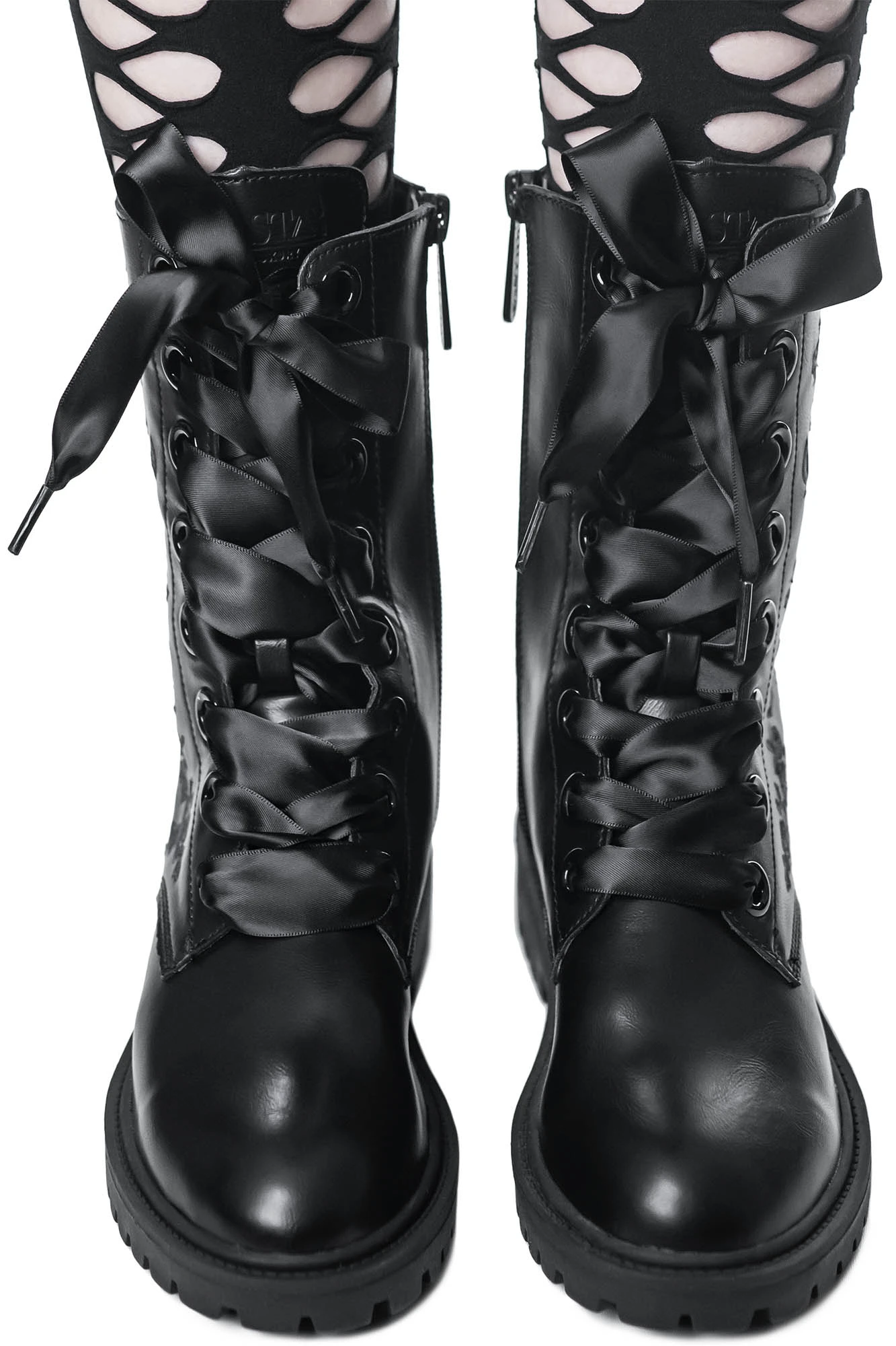 Create your own fairytale with the ‘Enchanted’ combat boots; featuring a textured faux-leather body with a satin lace-up front plus statement embroideries of pentagrams, roses, and crescent moons. Complete with slightly-elevated sole and side zip for easy on/off. Perfect for your dusk-to-dawn adventures!