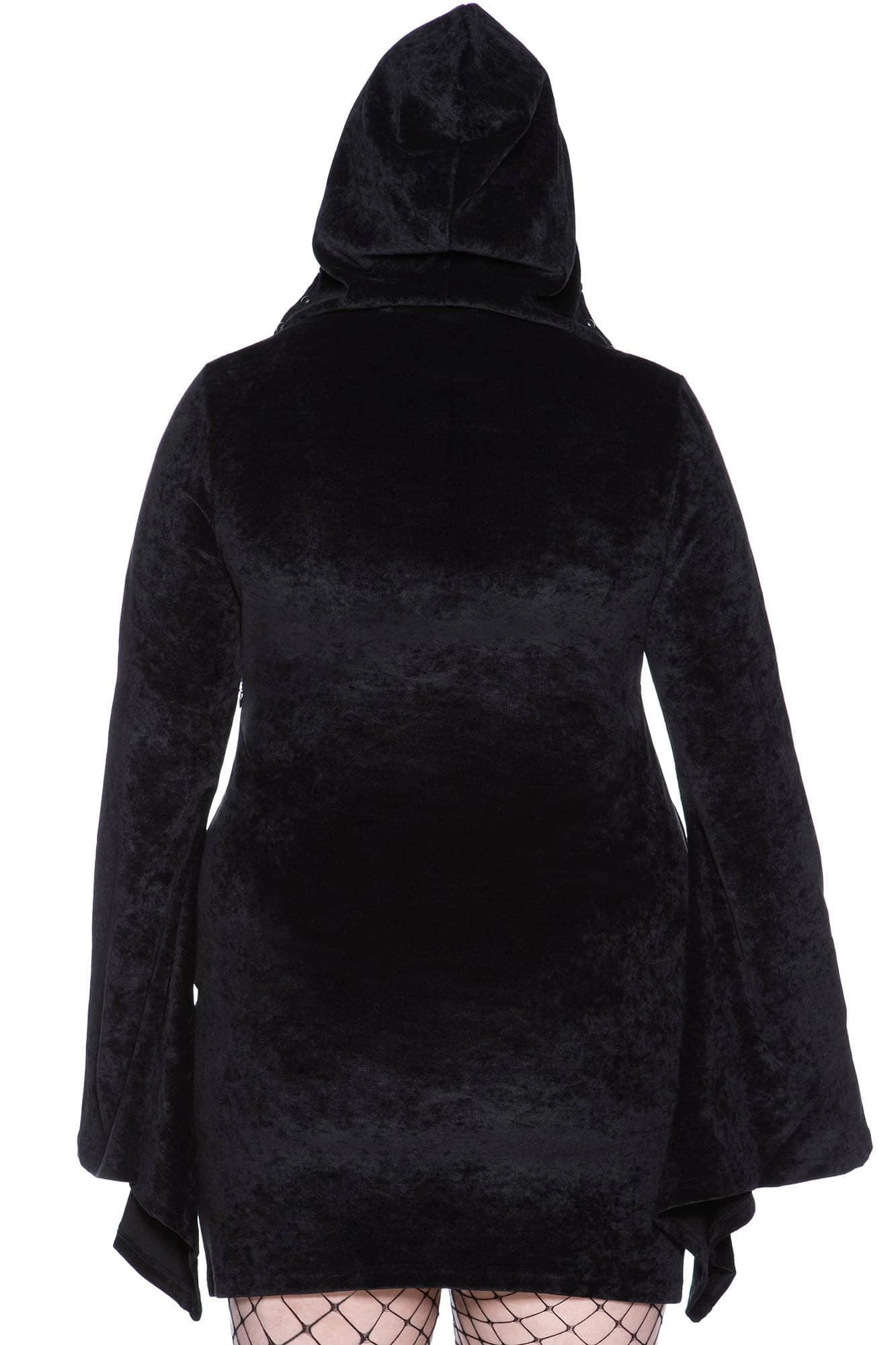 Live your life with unreasonable passion and see the magic that you can create. Channel yer inner goddess and look divine in the ‘Forbidden’ studded dress. Conjured using a luxe soft-touch faux-suede for a flattering and seductive fit. No detail has been spared; featuring sultry low-cut neckline, oversized hood, stud details on hood and front and dramatic flare sleeve perfect for a date with the devil or night out with yer coven. Oh-so versatile – perfect from dusk ’til dawn.