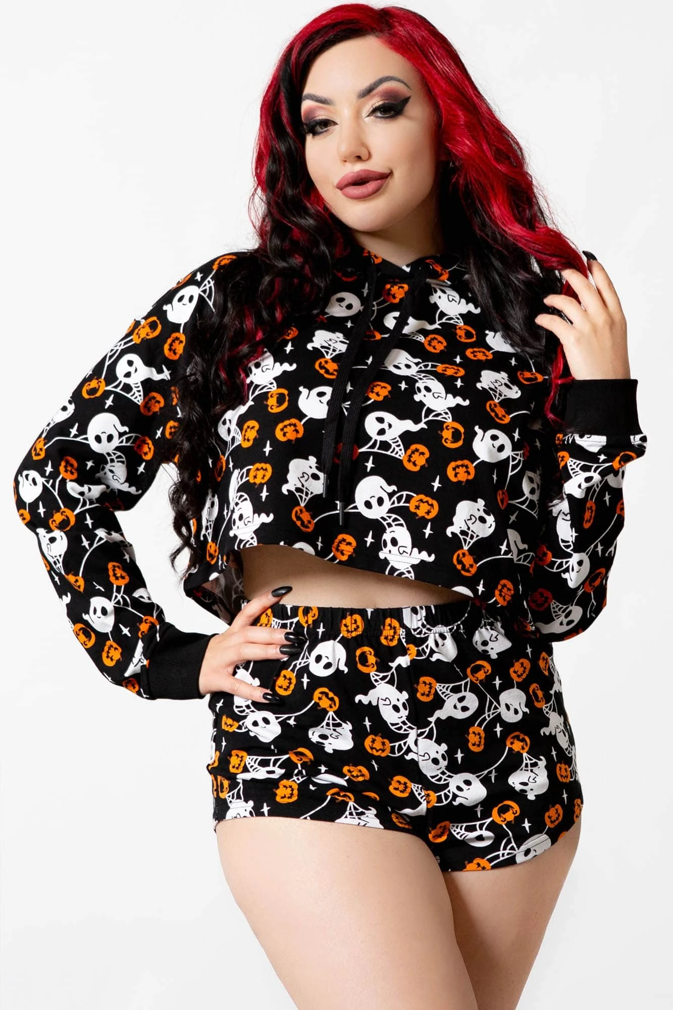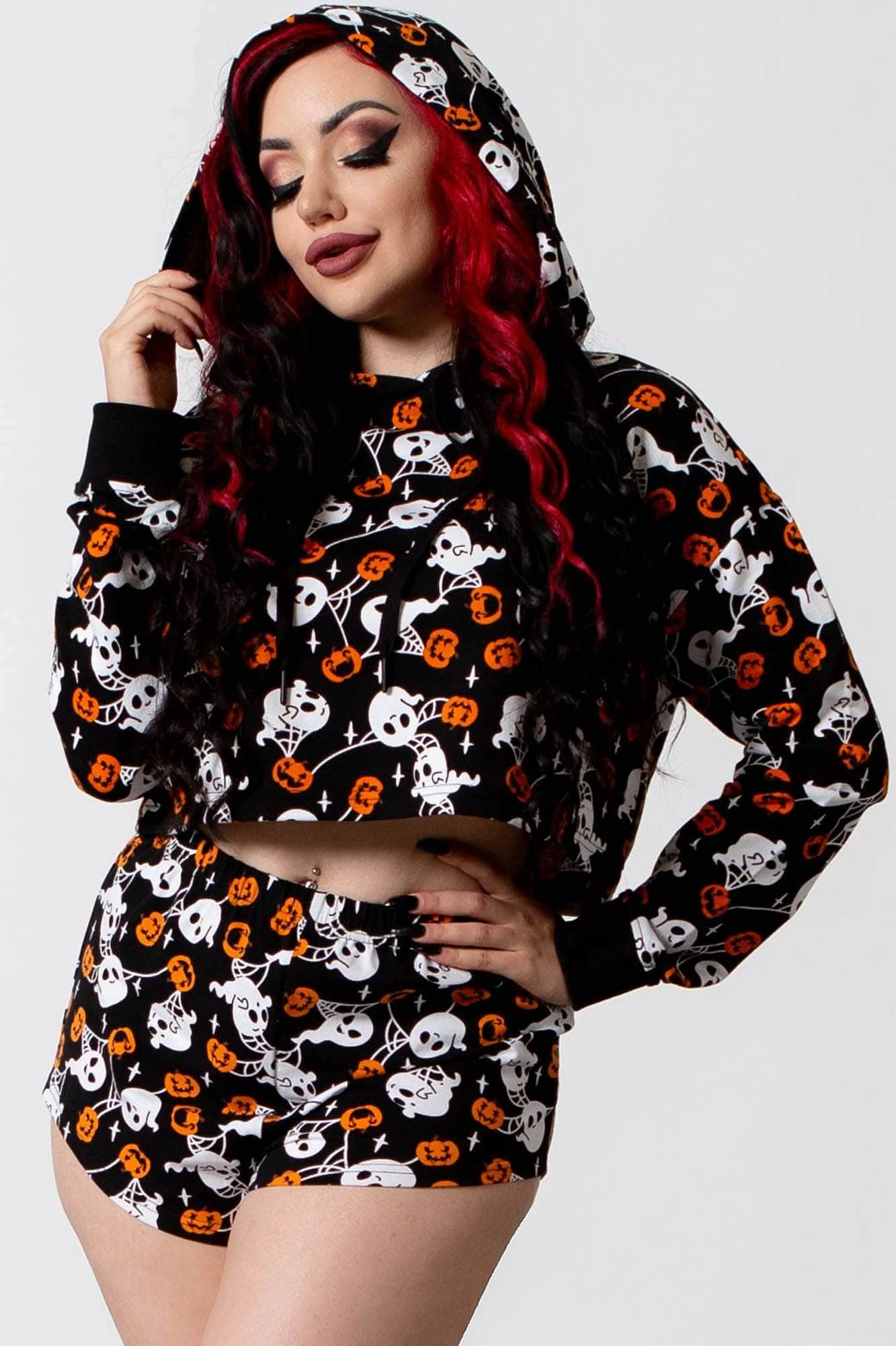 Look effortlessly cool whilst staying comfortable in the must-have ‘Haunted Pumpkin’ cropped hoodie. Constructed using a luxe soft-touch cotton mix which stretches perfectly for the ultimate fit! Features spooky print all over, long sleeves, a hood and cropped style. Purrfect for yer everyday errands or chillin’ in yer crypt – so versatile!