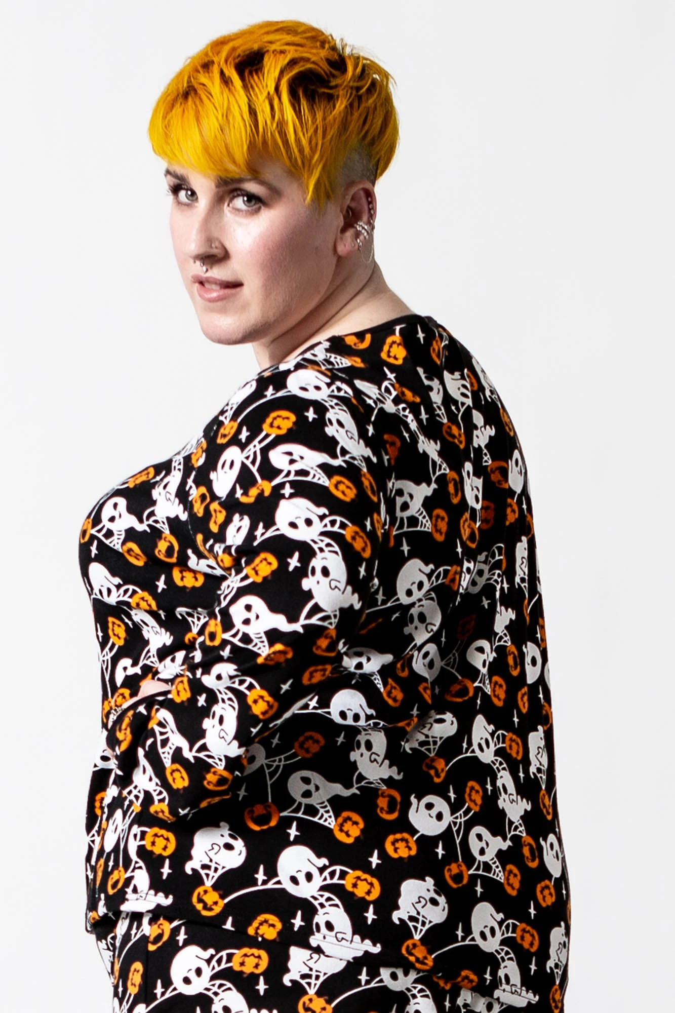 Get down and cozy with the ‘Haunted Pumpkin’ long sleeve top; featuring a fitted body with a round neck in a super-soft cotton-blend with just the right amount of stretch – for perfect comfort and fit! Contrasting print all over, ribbed cuffs and easy to wear from dusk to dawn.
