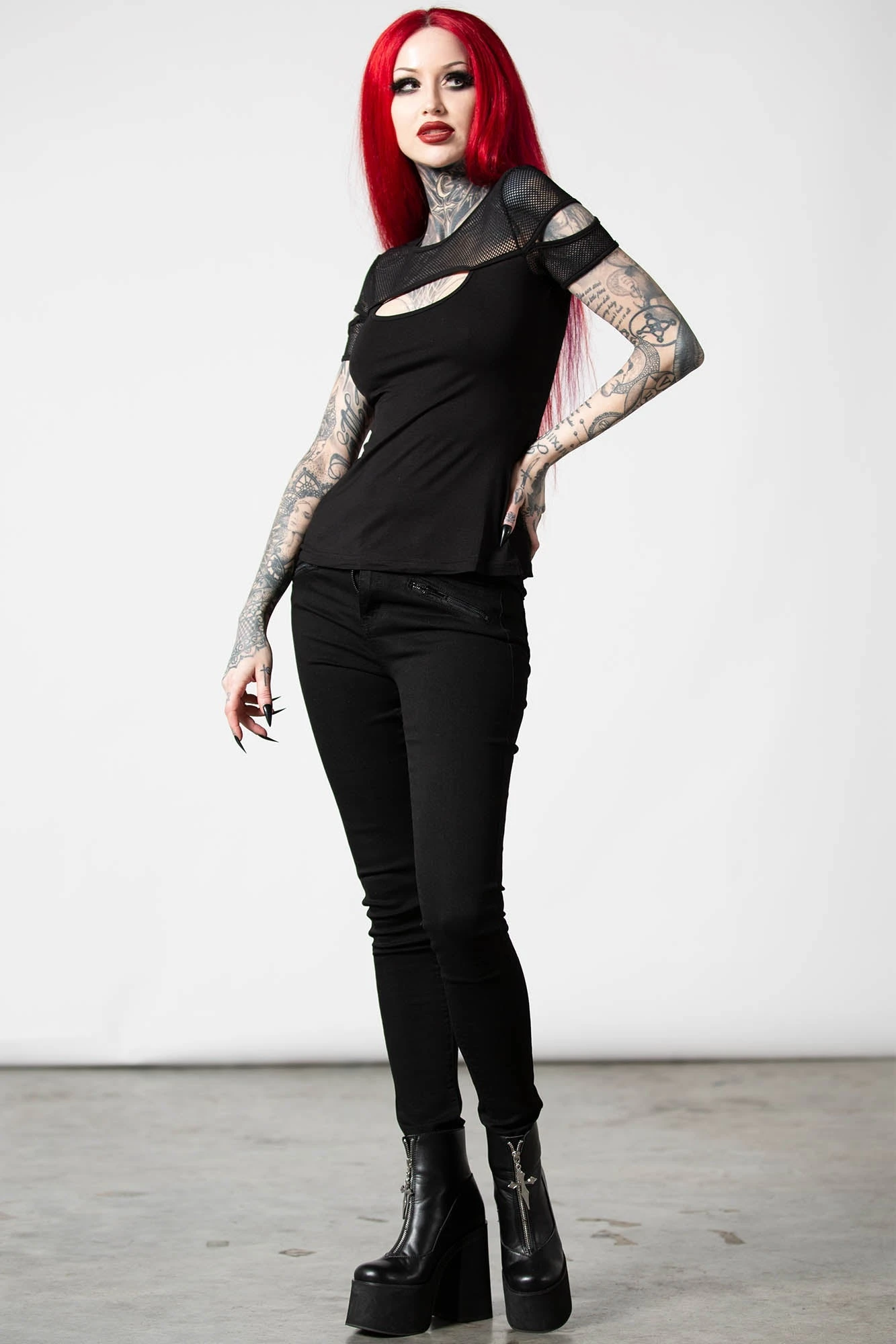 Stand out in our ‘Jovie’ top; Crafted with soft super stretch fabric to create the perfect figure hugging fit, with a keyhole detail, cut out fishnet sleeves detailed with straps this piece is a staple and a statement.