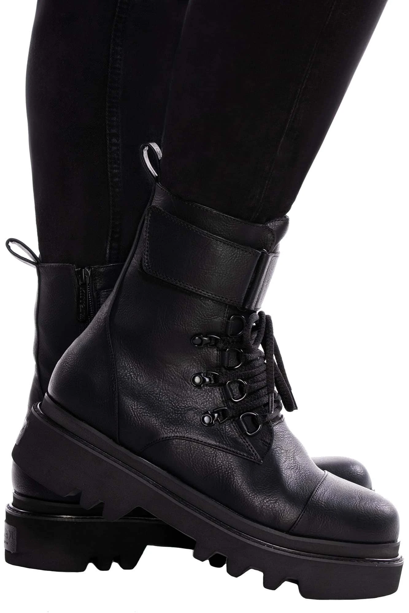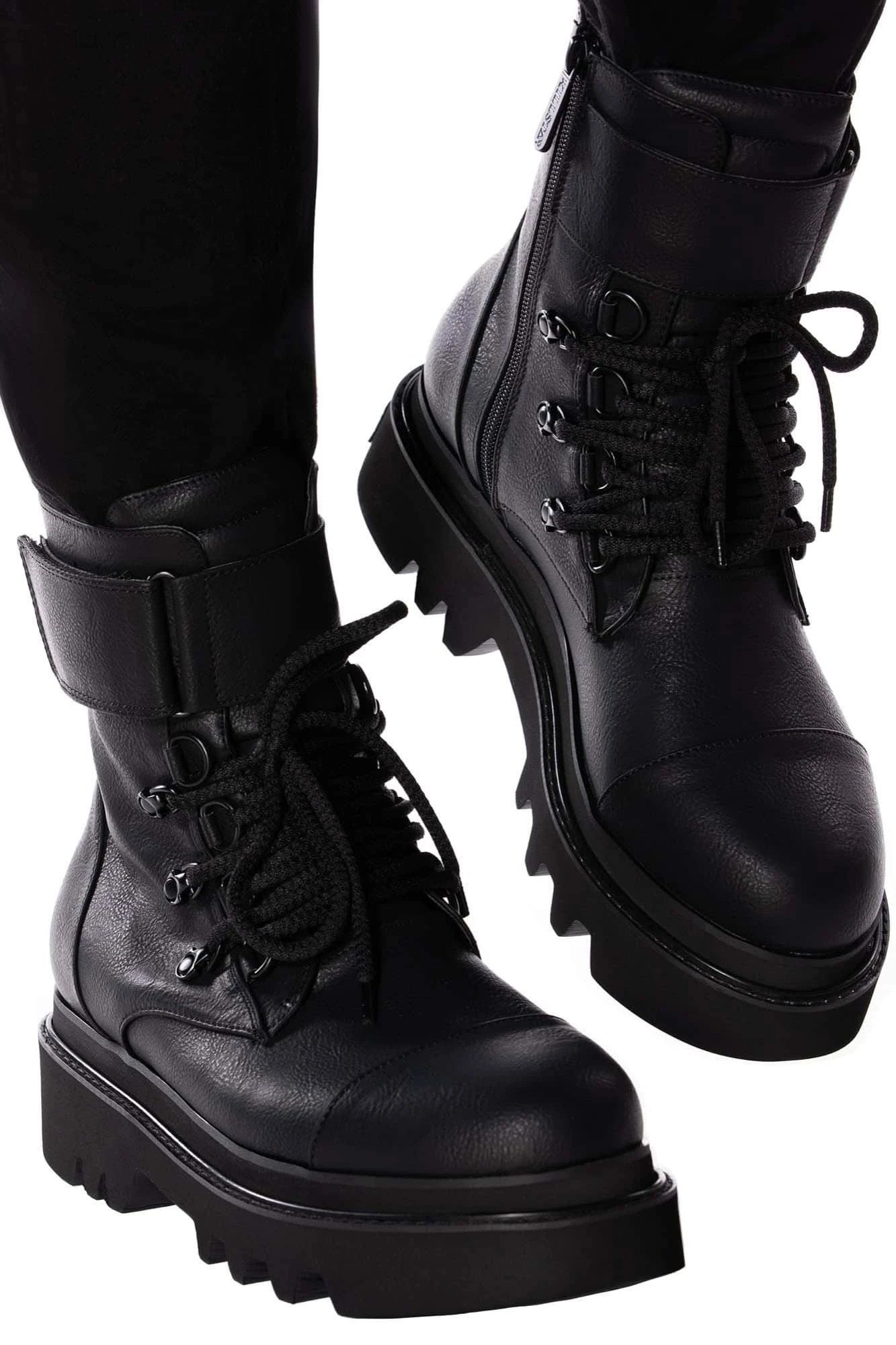 Make ’em look twice with envy with the oh-so-fierce ‘Ritualz’ boots. In a luxe faux leather with lace up front – featuring statement lace-up and buckle and side zip. Great for adding some serious attitude for yer day-to-day adventures out the crypt or causing havoc at night!
