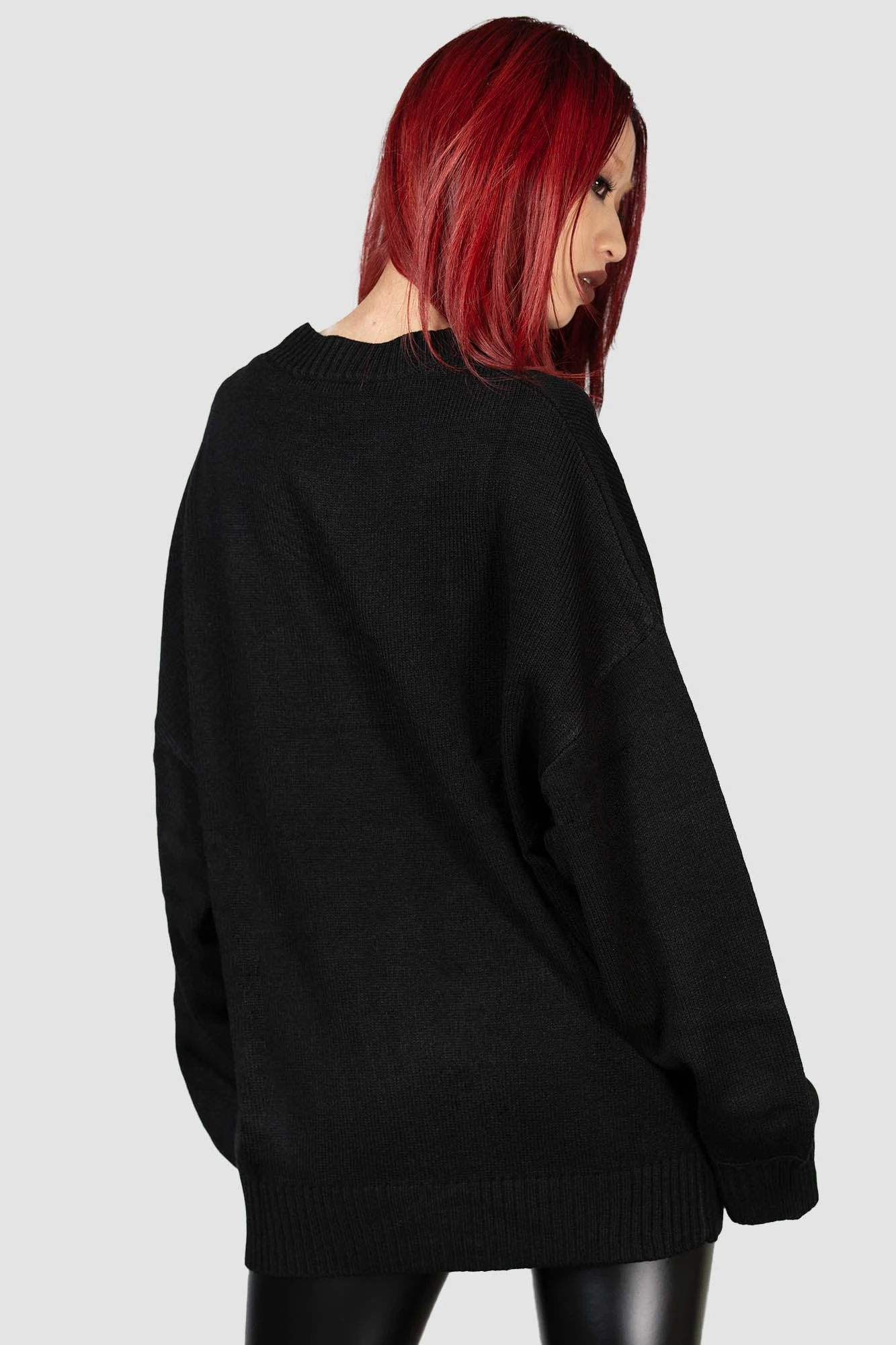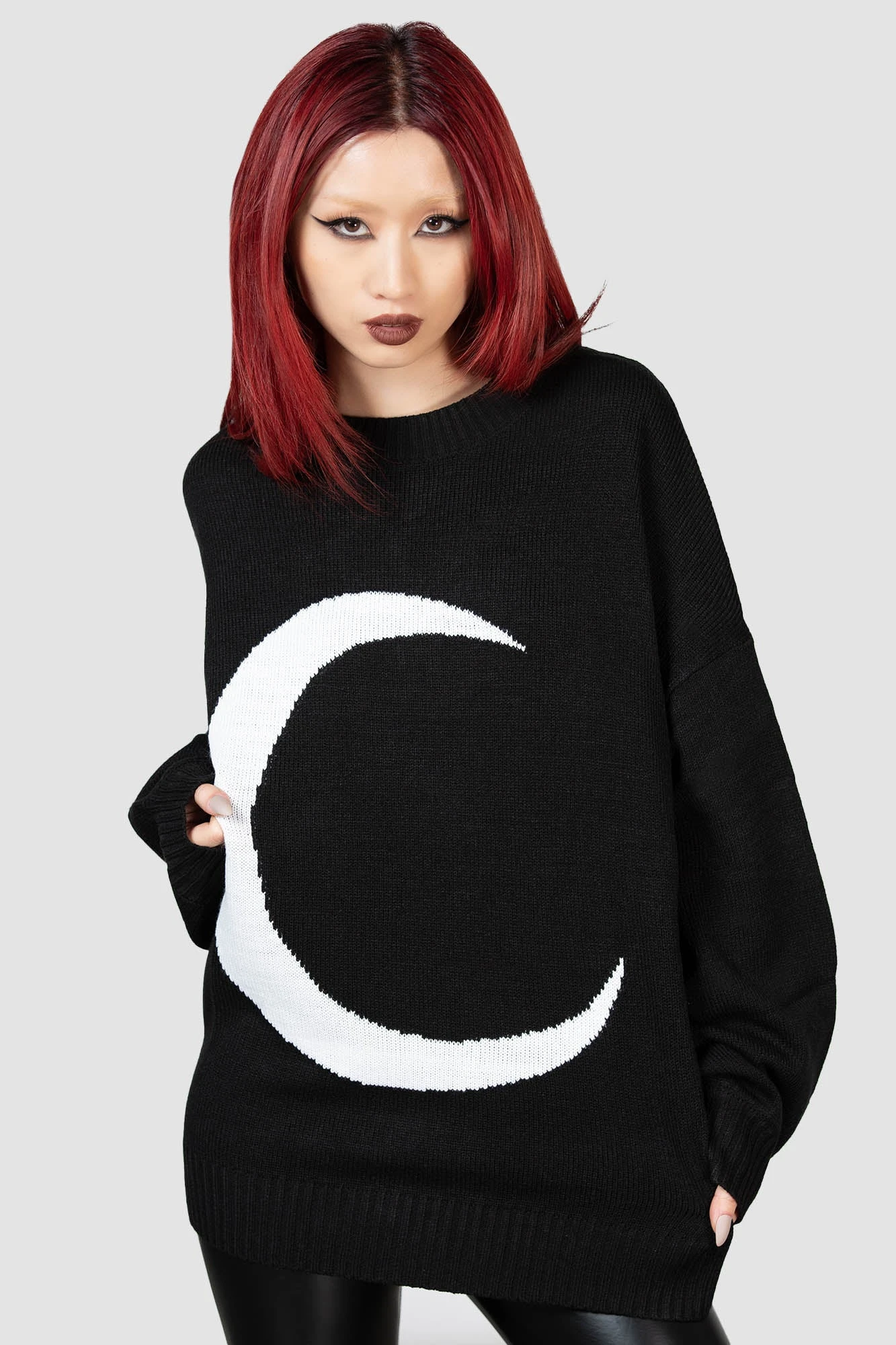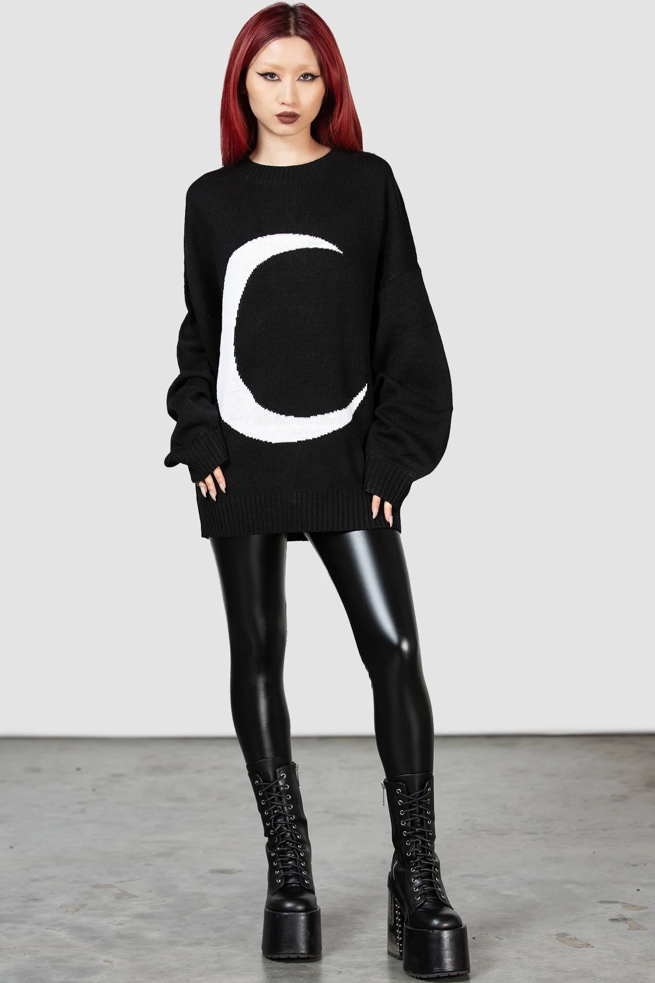 Cozy never looked so good – the ‘Selena’ knit sweater ticks all the boxes. Extra long length to easily be dressed up or down, with a round neck, and contrast crescent moon detail. Dress up or down as you dark heart desires; works both for warmer or colder looks!